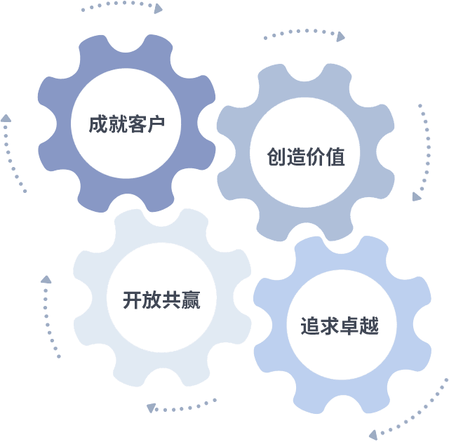 成就客户是一切决策的出发点,,,,创造价值是衡量所有工作的标准,,,,追求卓越是我们做事做人的态度,,开放共赢是我们的格局也是最终的结果。。价值观的齿轮环环相扣,,,,推动着组织里的每个人不断向前。。。